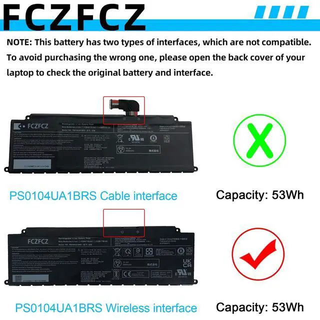 Part NumberPS0104UA1BRS 41CP5/63/71 (NOTE: The battery in the link does not come with a battery connection cable. This battery has two types of interfaces, which are not compatible. To avoid purchasing the wrong one, please open the back cover of your laptop to check the original battery and interface. ) ^^ Compatible with Machine Modelsfor Dynabook U30 Series; for Dynabook Tecra A40-J Series; for Dynabook Tecra A50-J Series. ^^ SafetyAll FCZFCZ products are Certified by CE, UL for safety. Each battery is factory tested before shipment and at good condition, and have its mark. Built-in circuit protection ensures both safety and stability. Each battery has high capacity to provide enduring, continual use. ^^ InstructionsPlease open the back cover of the laptop before purchasing and confirm that the original battery type is the same as the picture. Please read the battery instruction manual carefully before installing the battery. Please install the battery correctly and ensure that the battery interface and the motherboard are firmly connected. Please use the original charger to charge the laptop. After battery installation, discharge the new battery to 5% (not 0%), then charge and cycle 3-4 times to wake up the new battery.