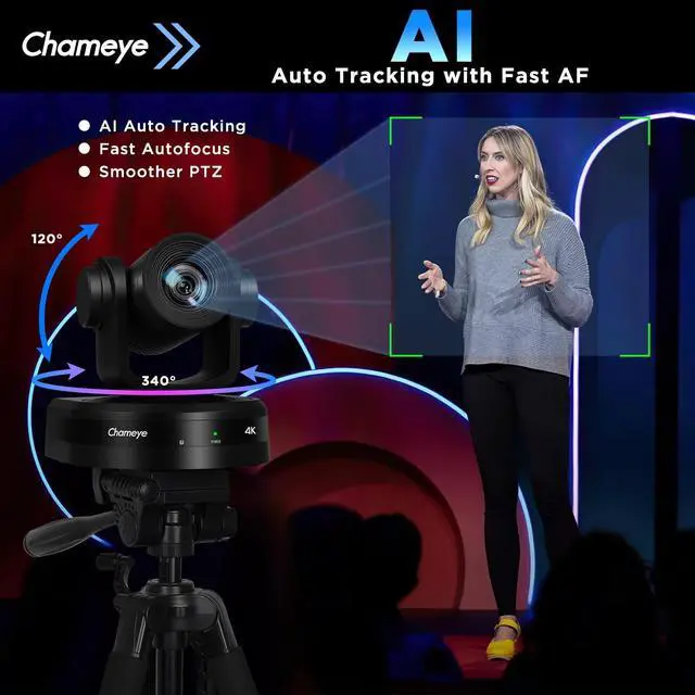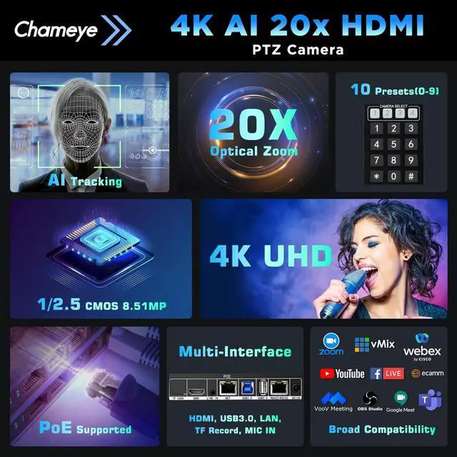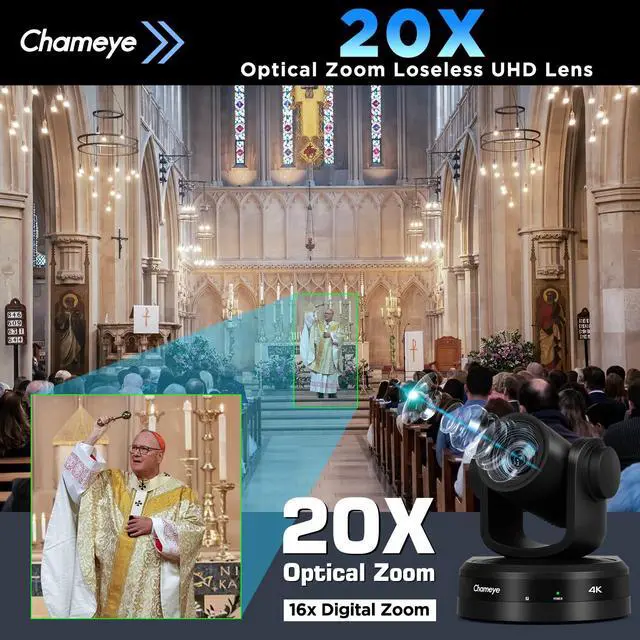 Chameye 4K PTZ Conference Camera with 1/ 2.5 -inch 8.51MP CMOS sensor delivers 4K (3840x2160) 30fps ultra-sharp, stutter-free video with zero motion blur. Equipped with advanced 2D&3D noise reduction tech, it optimizes image quality in real timeideal for church live services, worship events, video conferencing, education teaching broadcasts, and professional live streams. ^^ 20X optical zoom + 16X digital zoom with fast auto-focus ensures crystal-clear details even at long distances. PoE function enables power supply, control, and audio/video transmission via a single network cable. Seamlessly works with PTZ controller, video mixers, vMix/OBS, Zoom, Teams, and other mainstream live streaming & conferencing software.