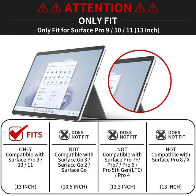 CompatibilityOnly compatible with Microsoft Surface Pro 11 (2024) 13 inch, Surface Pro 10 (2024) 13 inch, Surface Pro 9 (2022) 13 inch. Not compatible with any other devicesPlease confirm the model before your purchase. ^^ Material &CraftThis protective cover is made of high-quality genuine leather, which has delicate texture, elegant appearance, bringing your great soft touch feel. Precise cutouts let you access to all ports, speakers, controls and cameras. ^^ Auto Sleep/WakeSupport auto-wake/sleep function with easy snap on and off the iPad protective case to help extend your iPads battery life.