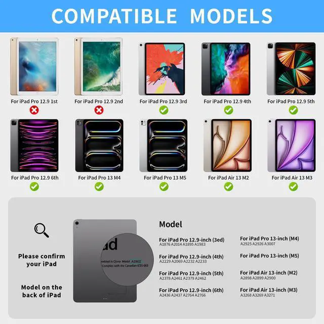 Ipad Keyboard: This keyboard case is specially designed for iPad Air 13 inch M3 2025 (A3268 A3269 A3271) iPad Air 13 inch M2 2024 (A2898 A2899 A2900) iPad Pro 13 inch M4 2024 (A2925 A2926 A3007) iPad Pro 12.9 inch 6th 2022 (A2436 A2437 A2764 A2766) iPad Pro 12.9 inch 5th 2021 (A2378 A2379 A2461 A2462) iPad Pro 12.9 inch 4th 2020 (A2229 A2069 A2232 A2233) iPad Pro 12.9 inch 3rd 2018 (A1876 A2014 A1895 A1983) ^^ Ipad Air 13 Inch Case Keyboard with