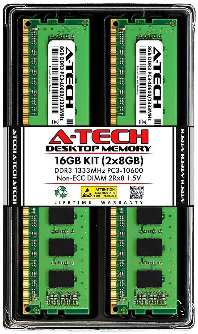 16 GB Kit ( 2 x 8 GB Modules ) ^^ DDR3 1333MHz ( PC3-10600 / PC3-10600U ) ^^ DDR3 DIMM ( 240-Pin ) ^^ Non-ECC UDIMM ( Unbuffered DIMM ) ^^ 2Rx8 - Dual Rank x8 ^^ 1.5V - DDR3 Standard Voltage ^^ High performance RAM Memory upgrade compatible with select DESKTOP PC Computer models ^^ *Please verify the supported memory (RAM) specifications of your system prior to purchase to ensure compatibility* ^^ Easy to install and boosts the performance of your system by speeding up loading times, improving system responsiveness, and increasing your system's ability to handle greater workloads ^^ All modules undergo quality assurance testing to ensure dependable and reliable performance ^^ A-Tech provides a Lifetime Warranty for all orders & offers complimentary United States based Tech Support before, during, & after your purchase