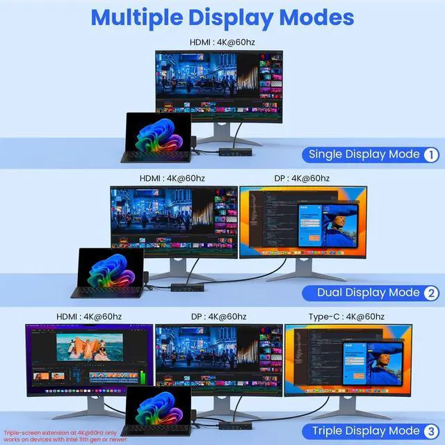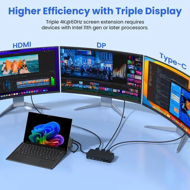 Display Support: Connect HDMI, DP, and full-function USB-C simultaneously to expand your workspace into three ultra-clear 4K@60Hz displays. Ideal for design, video editing, coding, and multitasking. (Triple 4K@60Hz display output requires Intel 11th Gen or later processors with MST support. ) ^^ High-Speed Data Transfer & Dual-Card Reader: Two USB 3.0 and two USB-C 3.0 ports deliver up to 5Gbps transfer speeds. SD/TF 3.0 slots support UHS-I and up to 2TB capacity, with both cards readable at the same timequickly import large files from cameras, drones, and other devices without delays. ^^