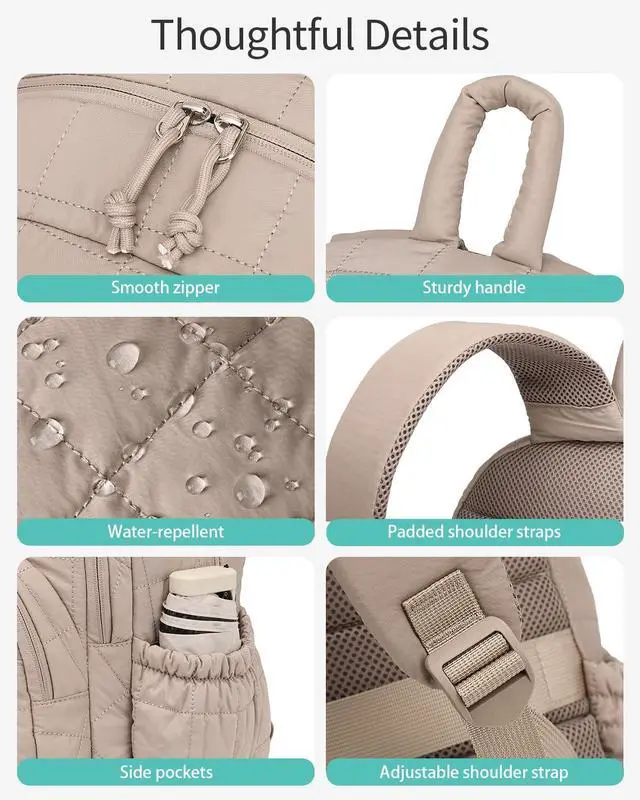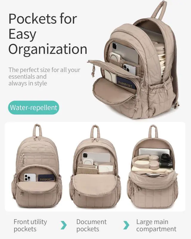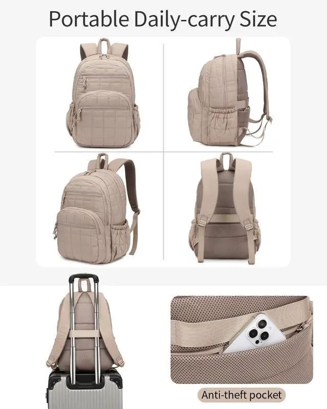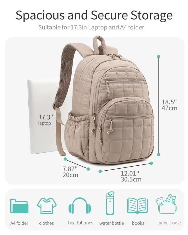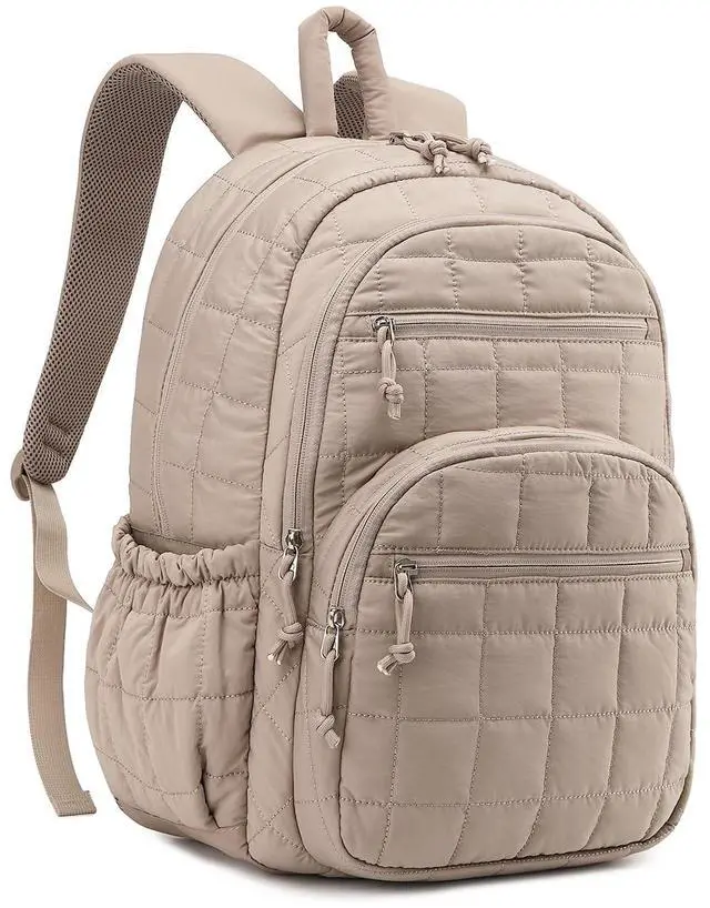 CLOKARS Bookbag for Women, Teen Girls Backpack for High School College Student, Puffer Quilted Back Pack Cute Laptop Backpack 17.3in for Work Travel Mom Casual, Camel