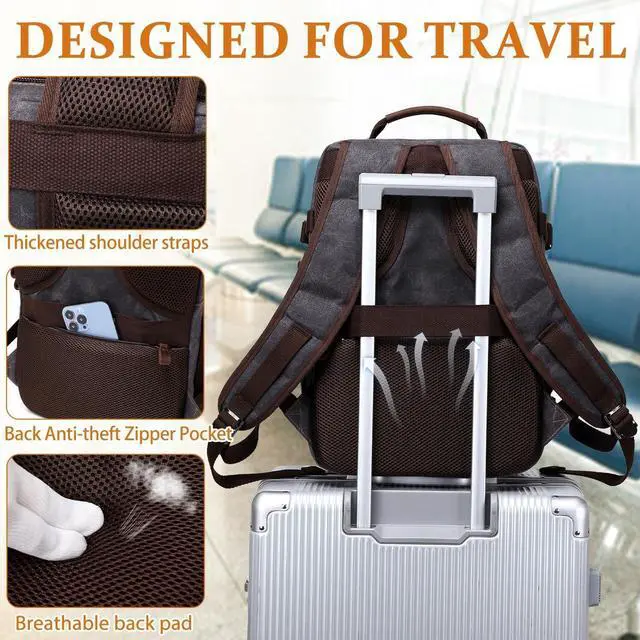 Dimensions & MaterialThe dimension of BOVIP travel backpack for men is 16.5 x 11 x 6.7 inches, weights 2.5 lb. This travel laptop backpack is made of high-quality waxed canvas, lightweight, water resistant fabric, ensure a long-term use. Comfortable soft padded back design with thick and soft breathable padding, this carry on travel backpack gives you maximum back support. ^^ Roomy Capacity & Multi-Pockets DesignOur laptop backpack for men features a spacious capacity with a reasonable partition: 3 main large compartments, 6 inner pockets, 2 front pockets, 2 side pockets and 1 back pocket. This business backpack for men with laptop compartment holds a 17 inch laptop, also providing a dedicated space for your pen, textbooks, phone, wallet, clothes, toiletries, books, bottle, umbrella and other travel essentials. Makes your item organized and easier to find. ^^ As Personal Item Airline ApprovedThis travel backpack carry on flight approved can be opened 180 degree easily and quickly at the airport security. This carry on backpacks for traveling is approved by most airlines and available to keep under the seat in flight as personal item, casual daypack is perfect designed for airplane traveling. ^^ Travel Backpack with Luggage Strap & Back Anti Theft PocketThis 30L personal item backpack features a luggage straps on the back of the backpack, design helps to free your hand and back by fixing the laptop bag on the trolley of your luggage, making your travel and business trips easier. Computer backpack with a hidden anti theft pocket on the back protect your valuable items from thieves.