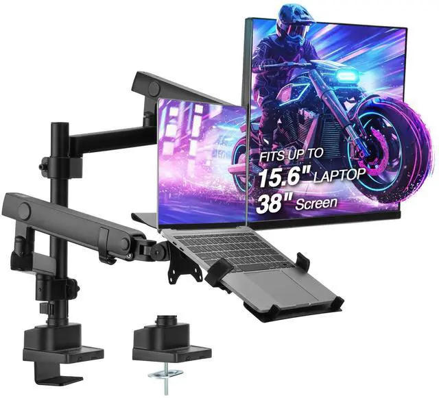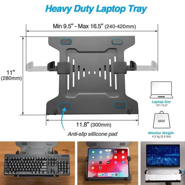 Supports 17"-38" monitors up to 26.4 lbs (12 kg) and laptops with adjustable height along tall pole, tilt, swivel, and rotation. Features cable management, and easy to install top mount to avoid crawling under your desk. ^^ Save Valuable Space - Heavy-duty metal base only take up 4.72" x 3.94" (120mm x 100mm) desk surface. The c-clamp and grommet mounting options support up to 1.96" (50mm) desk thick. ^^ Ergonomic Viewing Height - Mechanical spring monitor arm assists height adjustment from 7.2" to 28.5" (183mm to 725mm). Adjusting the monitor adapts to your posture by arm extension, vertical tilt, horizontal swivel, and landscape or portrait rotation.