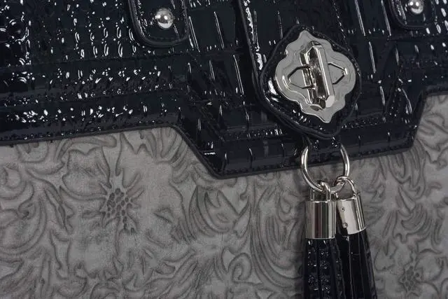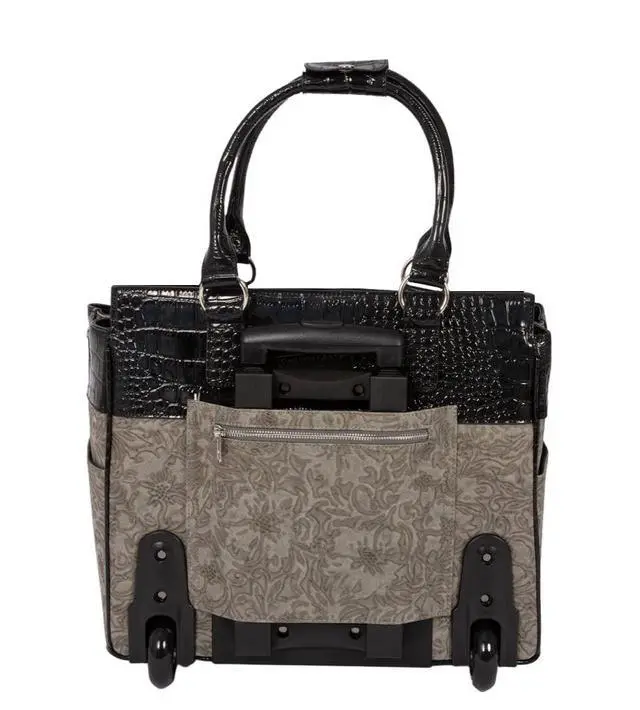 Stylish Design: Beautiful grey floral pattern with black patent alligator trim laptop bag, adding a touch of sophistication to your professional attire.
