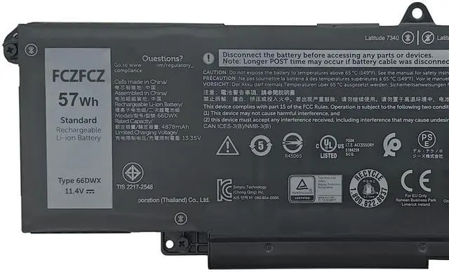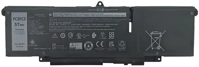 Condition: Brand New. ^^ Replacement for Part Number66DWX FH97R WW8N8 0HYH8 0CTJJ6 047T0 599M7 76KVG 2ICP6/65/78 3ICP6/65/78 (NOTE: Please kindly open your laptop back cover to confirm your original battery model is the same as listed here. Thanks! ) ^^ Compatible with Machine Modelsfor Dell Latitude 7340 Series; for Dell Latitude 7350 Series; for Dell Latitude 7440 Series; for Dell Latitude 7450 Series; for Dell Latitude 7640 Series; for Dell Latitude 7650 Series; for Dell P178G P178G001Series; for Dell P179G P179G001 Series. ^^ SafetyAll FCZFCZ products are Certified by CE, UL for safety. Each battery is factory tested before shipment and at good condition, and have its mark. Built-in circuit protection ensures both safety and stability. Each battery has high capacity to provide enduring, continual use. ^^ InstructionsPlease open the back cover of the laptop before purchasing and confirm that the original battery type is the same as the picture. Please read the battery instruction manual carefully before installing the battery. Please install the battery correctly and ensure that the battery interface and the motherboard are firmly connected. Please use the original charger to charge the laptop. After battery installation, discharge the new battery to 5% (not 0%), then charge and cycle 3-4 times to wake up the new battery.