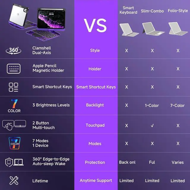 Silent Typing: The built-in pen slot allows you to store and access your Apple Pencil easily while preventing it from getting lost. The scissor-switch key design makes typing lighter, quieter, and more comfortable. ^^ Sleek Transparent Design with Premium ProtectionShow off your iPad's beauty with the transparent hard case, while the reinforced edges ensure robust protection from drops, scratches, and impacts. Ideal for those who value style without compromising safety.