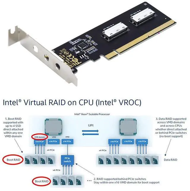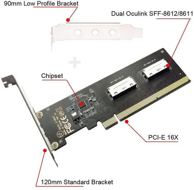 , backward compatible with PCIE 3.0. ^^ Dual Oculink SFF-8612 8X design, Stable installation, Can run 4 PCIE disks at full speed at the same time. Built-in multiple sets of high-power DC modules for sustainable and stable work. The innovative design can accommodate Four PCIEs of the chassis, and can support simultaneous operation.
