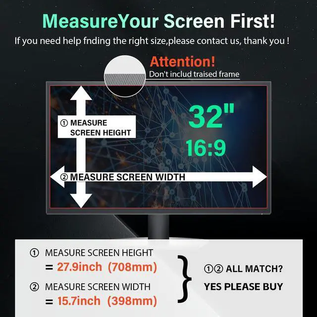 FILTER DIMENSIONSAdapted to monitor privacy screen 32 inch 16:9 aspect ratio, Width: 27 7/8" (708 mm), Height: 15 11/16" (398 mm), Diagonal: 32" ( 812.8 mm), Please verify your screen's width and height measurements before ordering. Compatible with Sceptre KYY Dell HP MNN ARZOPA Samsung Lenovo LG ASUS InnoView KEFEYA, ForHelp, YXK, AOC, SANSUI and other brands. Please verify your computer screen's width and height measurements before ordering. It is not recommended to select a size based solely on the diagonal ^^ 2025 NEW UPGRADEUnlike other 32 computer screen privacy shield, this magnetic Hanging patented 32 inch privacy screen for monitor is more solid and dust-proof than slide computer privacy screen, more Aesthetics and Practicality than the stick monitor privacy screen, more anti-glare and shatterproof than the regular hanging computer monitor privacy screen, so it won't let you down ^^ PRIVACY SCREEN FOR COMPUTER MONITOROur 32 inch computer privacy screen features advanced microlouver technology from Germany, only visibility at around 30 degrees and black out screens completely near 60 degrees ensure your electronic information confidential. With this monitor screen privacy you don't have to worry about information leakage in public ^^ UNIVERSE APPLICABLEMaoYeye's 32 inch privacy screen for monitors is just what you need for any type of screenthick, thin, curved, or touchscreen! We've spent a lot of time looking through countless reviews to figure out exactly what people want.