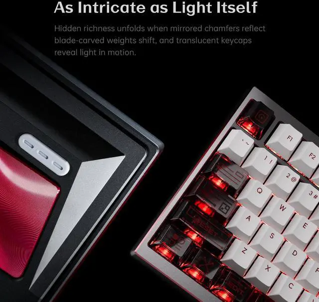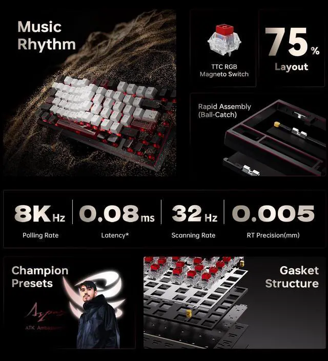 The ATK EDGE 75 HE is a high-performance 75% eSports keyboard engineered for precision and speed. Featuring a gasket-mount structure with Ball-Catch rapid assembly, it delivers responsive and satisfying keyfeel. Rapid Trigger (RT) actuation is adjustable anywhere between 0.005 mm and 3.3 mm in fine 0.005 mm increments, empowering gamers to optimize actuation for gameplay or typing comfort. With blazing-fast 32 kHz scanning, 8 kHz polling, and a response latency as low as ~ 0.08 ms, this keyboard ensures lightning-quick inputs. The CNC aluminum chassis with polished chamfers provides both durability and premium aesthetics.