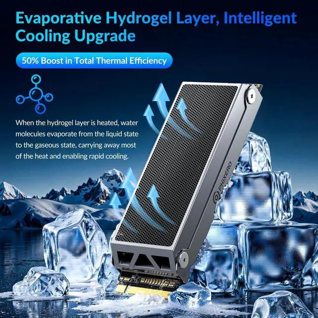 7450MB/s PCIe 4.0 SSDPHIXERO PSC NVMe SSD 2TB is designed for creators, gamers and professional users. Read speeds up to 7450MB/s and write speeds up to 6600MB/s. Effortlessly ensures smooth editing of 4K/8K multitrack media, instant preview, and immersive gaming experiences. ^^ 3D TLC NANDEquipped with premium 3D TLC flash and SLC caching technology, offering durability of up to 1200TBW. Easily handling long-term intensive usage. ^^ Innovative Multilayer Cooling SystemFeatures an innovative multilayer cooling system, combining Hydrogel Layer with an aluminum alloy shell, heat dissipation fins, and thermal grease.