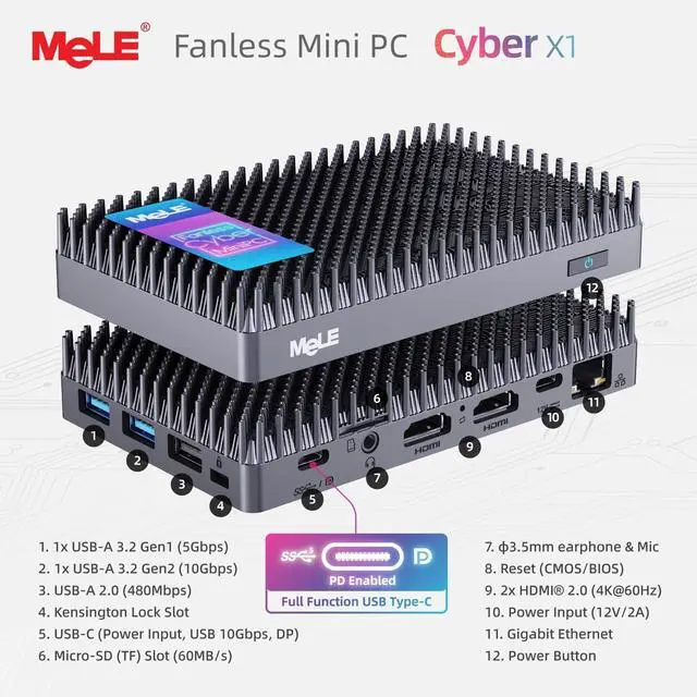 ^^ Wi-Fi 5 & Bluetooth 5.1 and PD 3.0 technology - The Mele mini PC incorporates advanced Wi-Fi 5 ( 802.11 ac) and Bluetooth 5.1 technologies, ensuring reliable dual-band connectivity ( 2.4GH z and 5GHz). With PD 3.0 technology, the mini PC can charge from 12V to 20V, providing flexibility with power sources (minimum 36W). Enjoy the convenience of a portable desktop PC anytime, anywhere, with swift connectivity and adaptable charging options. ^^ Elegant Fanless Cooling Design - This fanless PC features passive cooling system that prevents overheat. It provides a quiet and stable computing environment, supports 24/7 operation.