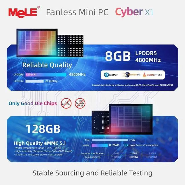 12th Gen Alder Lake-N150 - The MeLE Mini PC equipped with the powerful 12th Gen Alder Lake-N150 processor. Featuring 4 cores and 4 threads, with speeds of up to 3.4GH z, this micro PC delivers a 30% performance boost compared to its predecessors, the Celeron N5095 and N5105. With a low TDP of just 8W, it achieves robust performance at an exceptionally low power consumption. ^^ High-Speed Performance and Expandable Storage - Enjoy faster computing with 8GB RAM and 128GB storage. Ideal for home working, business offices, IoT, school education, and billboards.
