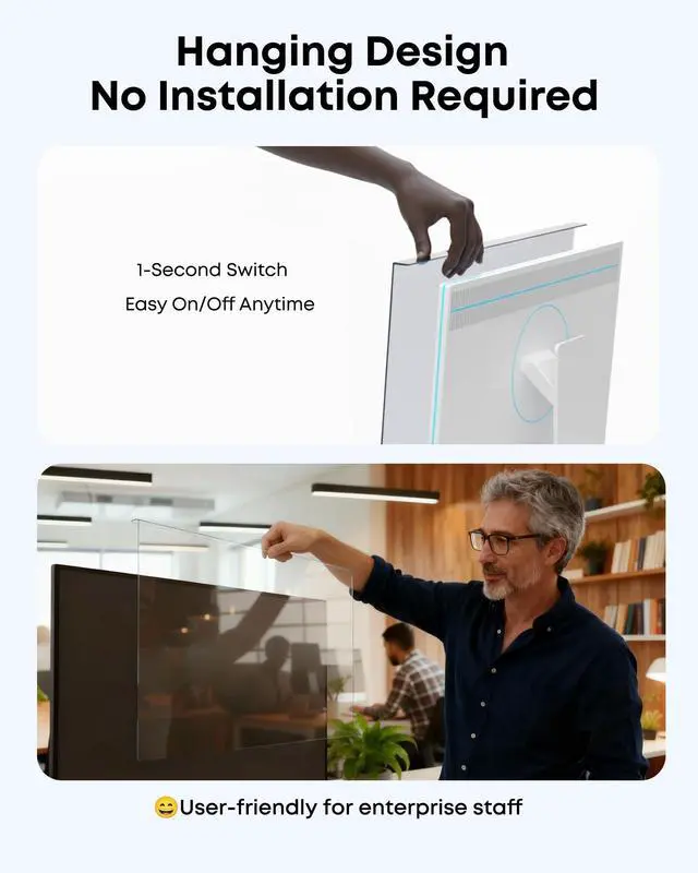 Powerful Blue Light & UV BlockingShields against 87% of harmful 460nm blue light (the main cause of digital eye fatigue) and 97% UV rays, relieving eye strain, dryness, and sleep disruption from long screen hours. ^^ Hanging Design for Instant UseTool-free & no installation neededhang on your monitor in 1 second, easy on/off. Perfect for remote workers, students, and busy professionals who want hassle-free eye protection. ^^ 93% HD Clarity & True ColorHigh light transmittance ensures crystal-clear visuals with no blurriness, color distortion, or dimness. Enjoy work, gaming, or streaming without compromising your monitors original display quality.