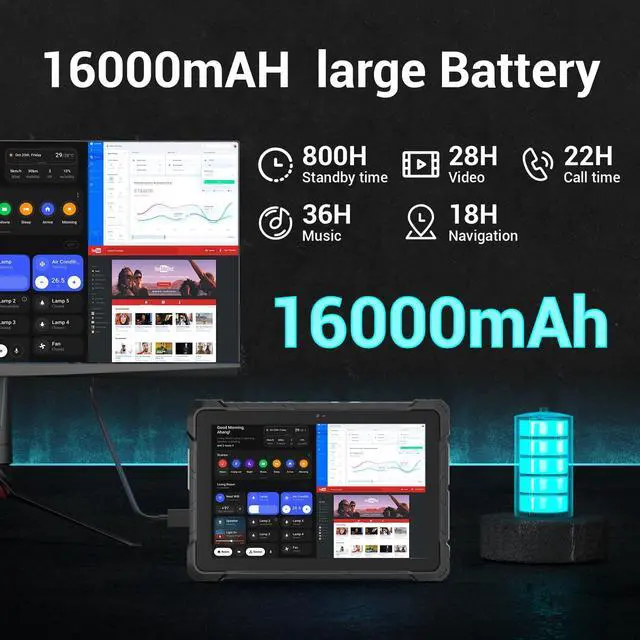 It comes with Dual - Band WiFi ( 2.4GH z + 5GHz) and Bluetooth 5.0 for seamless wireless connectivity. Additionally, it features comprehensive I/O ports including HDMI 2.0, USB 3.0, Type - C 3.1, DB9 serial (RS232), and TF expansion. There's also an innovative magnetic docking system for instant desktop integration and charging, ensuring seamless connection with various devices. ^^ All - Day Battery Life Equipped with an 8000mAh/ 7.6V mega battery, this tablet offers an industry - leading 10 + hours of continuous use. You can rely on it during long shifts in the field, on construction sites, or in outdoor operations without worrying about frequent charging.