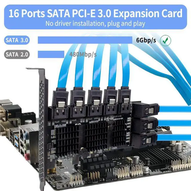 UNLOCK THE PERFORMANCE OF YOUR SSD WITH A PCIE SATA CARDACTIMED PCIe Express 3.0 to 16-Ports Adapter opens the possibility to connect Multiple HDD/SSD to your computer at peak performance. ^^ A SIMPLE CONNECTION Simply plug and play style setup. Install a hard drive to this component. RAID Support, Massive support of up to 256TB of storage. ^^ POWERFUL CHIPSET & ADVANCE HEATSINK Maximize your efficiency, stabilize your performance, and reduce error rate with ASM1064 & JB575 x3 chip. Also, optimized cooling with aluminum heat transfer and maximize the effect of heat dissipation with a Heat-Sink.