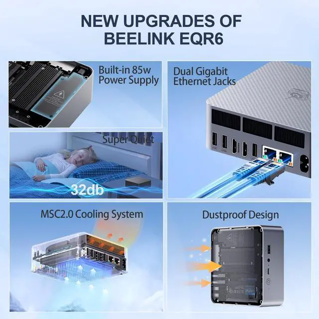 New Breakthrough Designs: Beelink EQR6 mini pc is built in with 85W power supply, simplify your space with less cable clutter. The MSC 2.0 cooling system brings stronger heat dissipation and help the AMD mini pc runs smoother and quieter. The dust filter prevents dust accumulation inside the small pc, making cleaning the EQR6 less cumbersome and ensuring trouble-free operation ^^