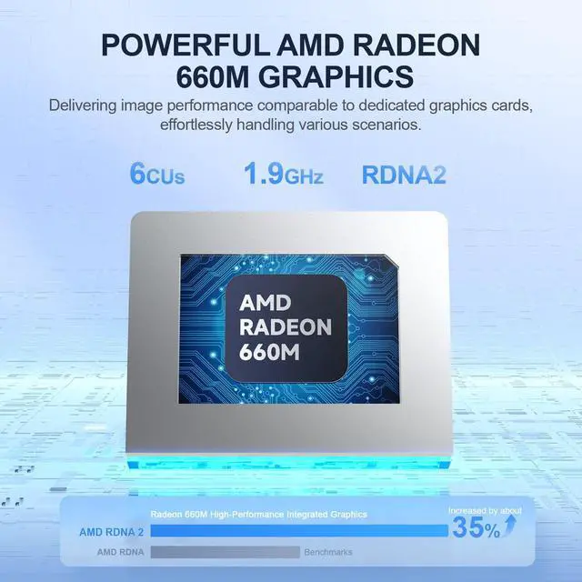 AMD Ryzen 5 6600U: This Beelink Mini PC is equipped with AMD Ryzen 5 6600U (6 cores 12 threads, 2.9 GHz - 4.5 GHz, 16M L3 Cache). The performance of 6600U mini pc is improved by 12% compared to 5650U. This mini computer is integrated with an AMD Radeon 660M 6 core 1900 MHz graphics, ideal for office work, editing high-resolution videos and images, multimedia playback with KODI or IPTV up to 4K and light gaming ^^ 24GB LPDDR5 & 500GB