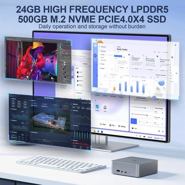 PCIe 4.0 SSD: EQR6 mini pc comes with 24GB LPDDR5-5200MHz RAM and 500GB M. 2 2280 PCIe 4.0 x4 SSD (two SSD slots, max 4TB * 2, speed up to 7000MB/S, 2 times faster than PCIe 3.0 ). Large capacity helps to save more large programs in the computer and brings smoother operation of multi-tasking. High-speed SSD enables quicker load time of large files and high resolution content ^^