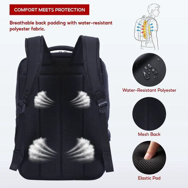 Secure Protection: Equipped with a dedicated padded, shock-absorbing laptop compartment, this laptop backpack for men and women securely fits laptops up to 15.6 inches, protecting your computer from bumps, scratches, and movement. Perfect as a professional laptop backpack for office, meetings, or travel. ^^ Premium Water-Resistant & Durable Polyester Construction: Made from high-quality water-resistant polyester, this computer backpack resists water, dust, and stains for long-lasting use. The triple-layer inner lining helps manage moisture, reduce odor, and maintain cleanliness, making it a reliable travel backpack and work bag for everyday use. ^^ Ergonomic Design for All-Day
