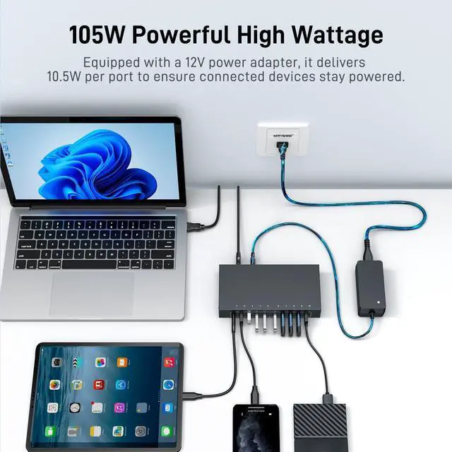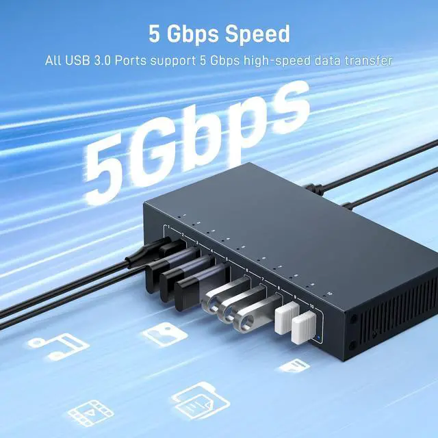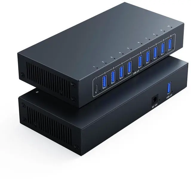 [Industrial 105W Output] This Yinker 10 Port USB 3.0 Hub equipped with 12V3A power adapter, can provides a total of 105W power to all devices and 10.5W per port. Ideal for high consumption data transfer. Plug and play, no driver needed. ^^ [5Gbps Fast Speed] Equipped with a powerful chip, can offer 5Gbps transfer speed which is 10x faster than USB 2.0. Transferring large files is a breeze, keeping you ahead in both work and entertainment. ^^ [Rugged Metal for Mount] This Industrial USB Data Hub made of all metal case + ventilation cooling holes, can reduce heat disspation and prolong serve life.