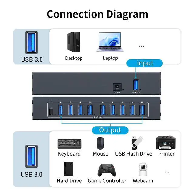 The 2 mounting ears, allow easily install in desktop and wall, or server racks/industrial components, ideal for server rooms and industrial controllers. ^^ [Wide Compatibility] This USB Expander with 1x upstream port + 10x downstream ports, supports Windows, Mac, OS, Linux, etc. Compatible with smart phone, tablet, home webcam, keyboard, mouse, printer, flash drive, etc. ^^ [What Inside Box] Package with 1x USB 3.0 Hub, 1x USB 3.0 Cable, 1x 12V3A Power Adapter, 1x Foot Pad, 2x Mount Ear.