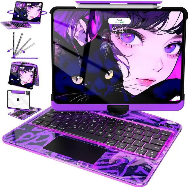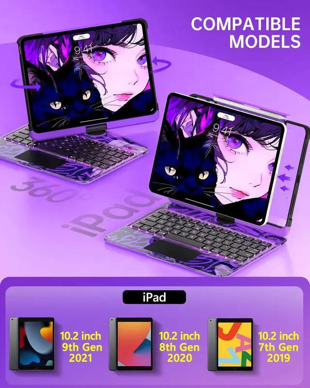 Intermerge for iPad 9th 10.2 inch Keyboard Case, 360 Transparent Multi-Touch Trackpad, 7-Color Backlit Keyboard, Pencil Holder, Type-C, Power Indicator for 9th/ 8th/ 7th - Neon Pulse