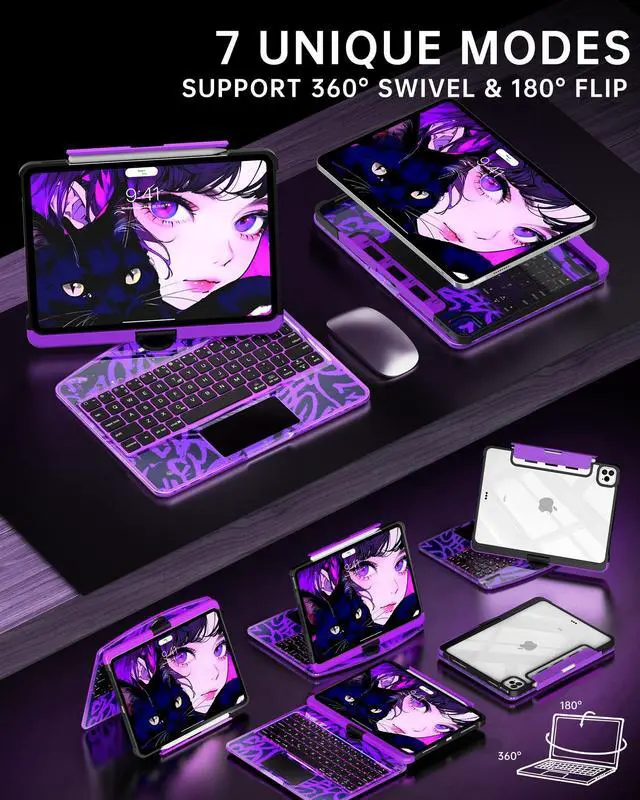 • Swivel Adjustable Stand 360 rotatable hinge and 180 fold support laptop, tablet, tent, and presentation modes with versatile viewing angles.