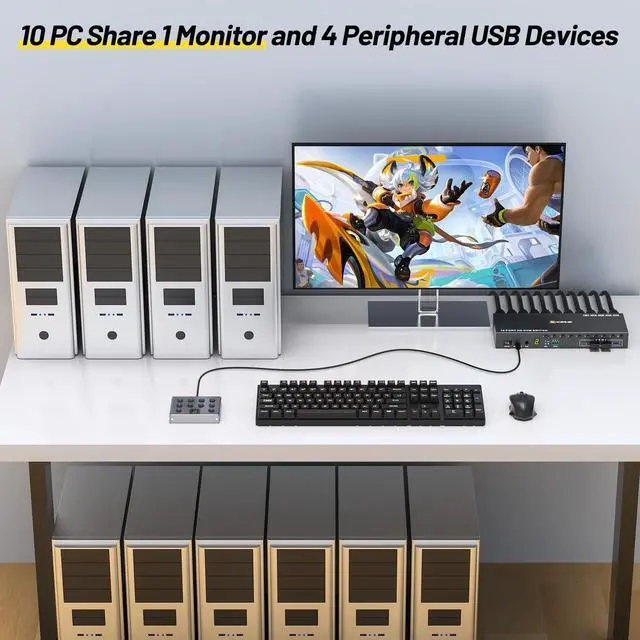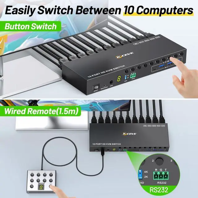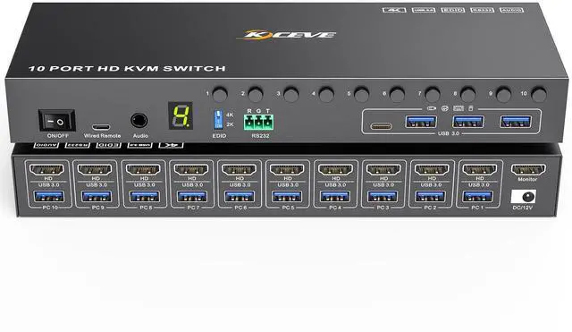 10 Port HDMI KVM SwitchThis 10 ports KVM switch can control up to 10 computers to share 1 monitor with 1 set of Wired or Wireless keyboard mouse. You can easily switch by panel button, wired remote (included) or RS232 between 10 computers on 1 monitor and share 4 USB 3.0 devices, LED lights indicating the active computer. ^^ KVM Switch with EDID simulationMLEEDA 10 port KVM switch, store the resolution and refresh rate of the display, and when the monitor is switched between 10 computers, the original window position will not be changed, while other KVM require the user to rearrange the window order.