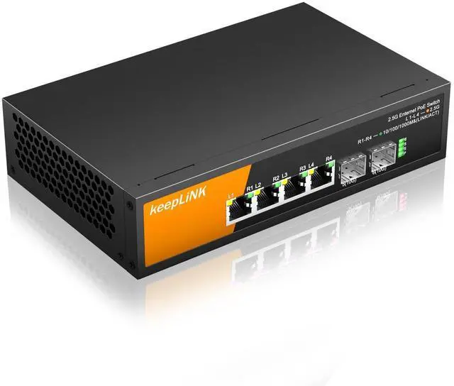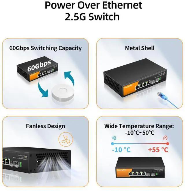 PoE Switch: 4 2.5G ports & 2 x 10G SFP slots unlock the highest performance with multi-gig bandwidth and provide up to 60Gbps of switching capacity.