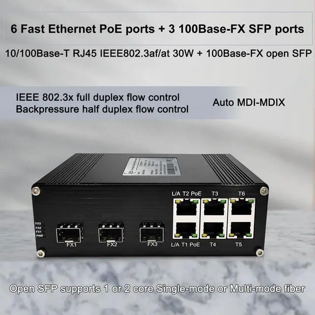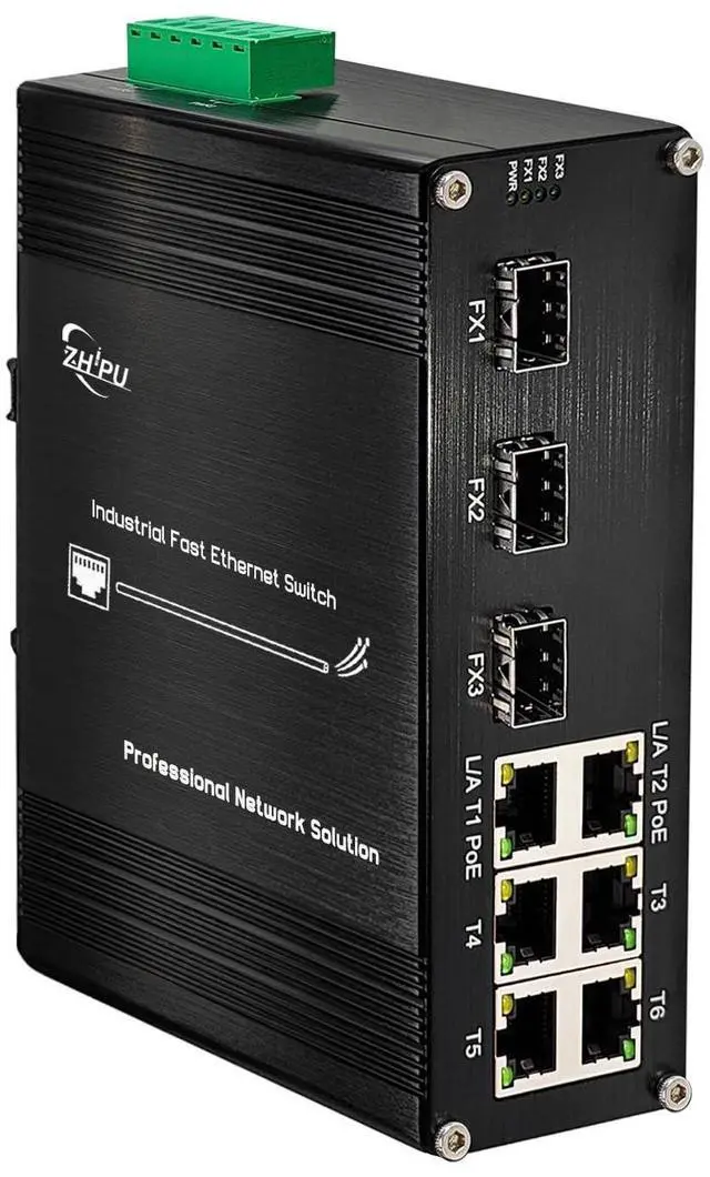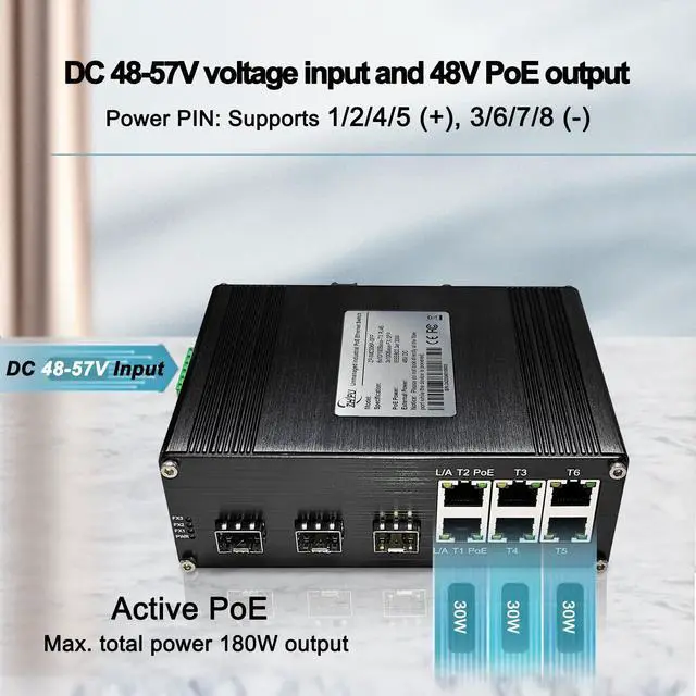 Complies with IEEE 802.3 af/at PoE power supply standard, automatically identifies PoE devices for power supply, and does not damage non PoE devices. The maximum PoE output power of single port is 30W. ^^ 6 10/100Base-T RJ45 ports support intelligent PoE power supply, meeting the PoE power supply needs of security surveillance, telephone conference systems, wireless coverage and other scenarios. ^^ Industrial dual power backup and voltage input (48-57V DC) design, can be powered simultaneously or separately, and requires the same voltage input when powered simultaneously. ^^ Design of super strong 6KV lightning protection function, The lightning protection level of the port is common mode 4KV and differential mode 2KV.