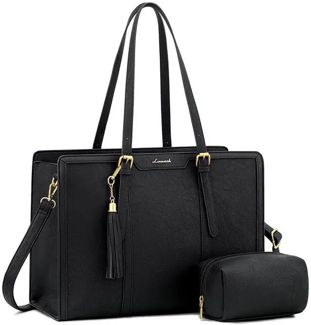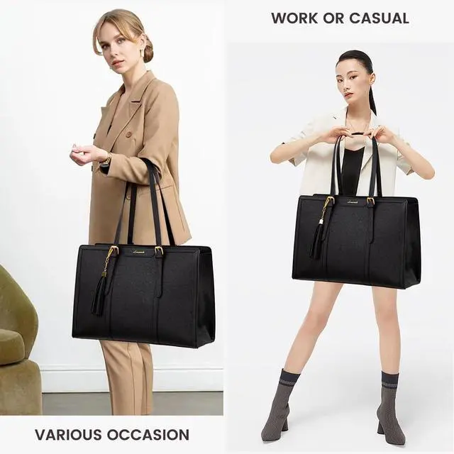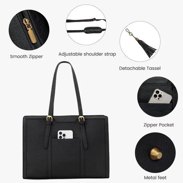 Elegant Laptop Tote Bag & Stand Upright This laptop bag for women combines vintage charm with modern fashion, making it a classic accessory that never goes out of style. Its metal feet ensure that the work bag stands upright and maintains its shape, adding to its overall sophisticated look. ^^ Large Capacity & Multi-Pocket Tote Bag With multiple pockets and compartments, this work bag offers generous storage capacity. Organize and carry all your essential items, such as your laptop, Water bottle, notebooks, pens, and more, with ease and convenience.