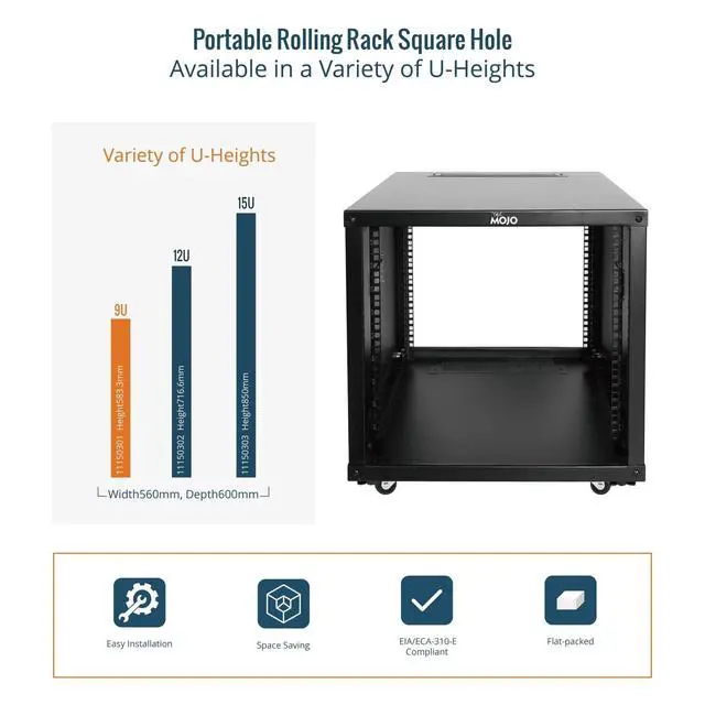 Universal: EIA/ECA-310-E compliant; Equipped with installation M6 cage nuts and screws; Available in 9U, 12U, 15U