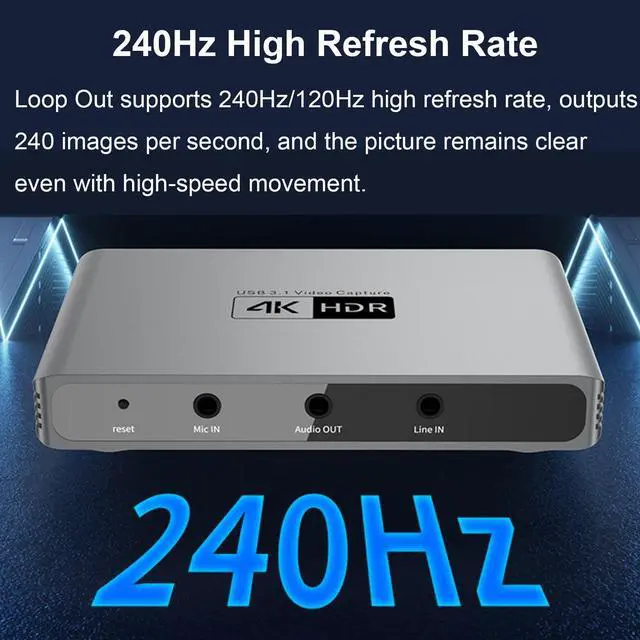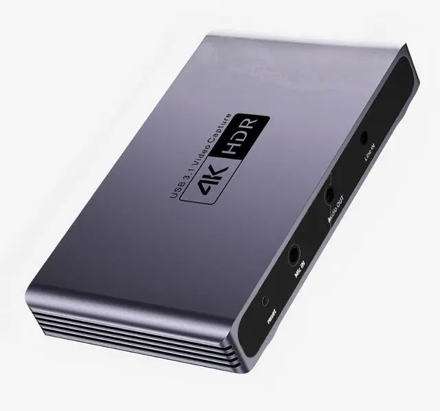 The device features convenient audio connectivity with Mic IN, Audio OUT, and Line IN ports, giving you complete control over your audio setup. Its sleek, compact aluminum design with efficient heat dissipation ensures reliable performance during extended recording sessions. Whether you're capturing gameplay, creating tutorials, or recording professional presentations, this video capture card delivers the performance and versatility you need to produce high-quality content.