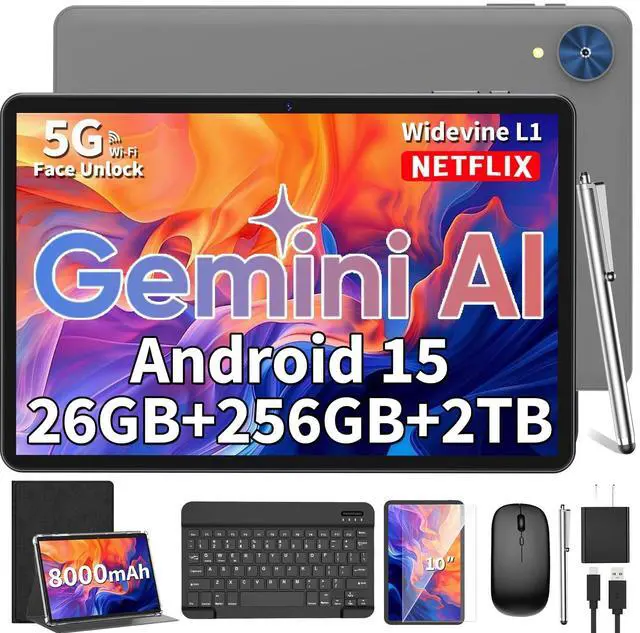 2026 Android 15 Tablet, 10 inch Tablet with Keyboard, 24GB+256GB+2TB Expand, 2-in-1 Tablets with 8-Core, 5G WiFi, 8000mAh, BT5.0, GMS, GPS, Gemini AI, Tablets PC with Mouse, Case, Stylus (Black)