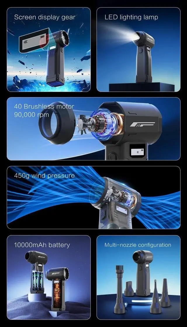This hand - held electric blower has 9 - speed wind adjustments and can be precisely adjusted according to different scenarios and needs. The 40mm brushless motor brings strong power, capable of handling both delicate cleaning and heavy - duty tasks. The multi - purpose air nozzles are easy to replace and adapt to various scenarios. The LED auxiliary lighting expands the usage environment, the intelligent screen provides real - time status feedback, and the 10, 000 mAh battery with a protection board ensures long - term, stable and safe use.