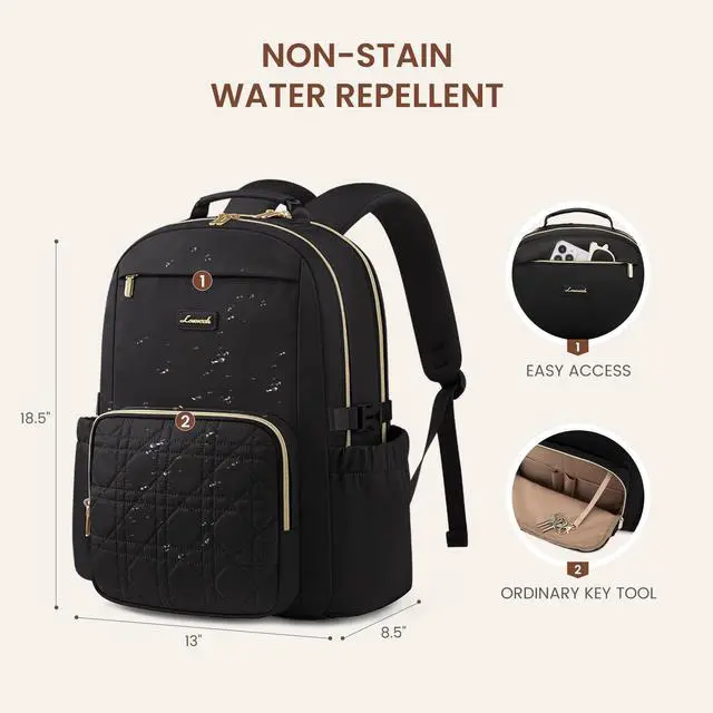 • Upgraded LOVEVOOK Laptop Backpack for Women: Smooth double LOVEVOOK no-slip metal zippers.NON-STAIN,water-resistant and durable polyester fabric.Cute and stylish color combination.FASHIONABLE AND FUNCTIONAL.Total of 4 compartments and 14 pockets for your computer,A4 folder,bottles,umbrellas,clothes,work supplies,college supplies and travel essentials.size: 13L 18.5H 8.5D, weight: 2.15lb.