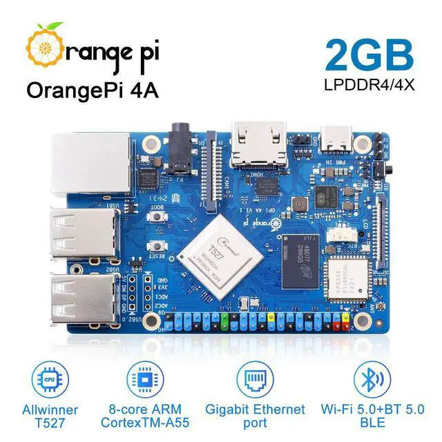 Processor]: The Orange Pi 4A is powered by an Allwinner T527 octa-core Cortex-A55, featuring HiFi4 DSP and RISC-V co-processors, and supports 2GB/4GB LPDDR4/4X. With a 2TOPS NPU, its built to handle advanced edge AI acceleration needs.