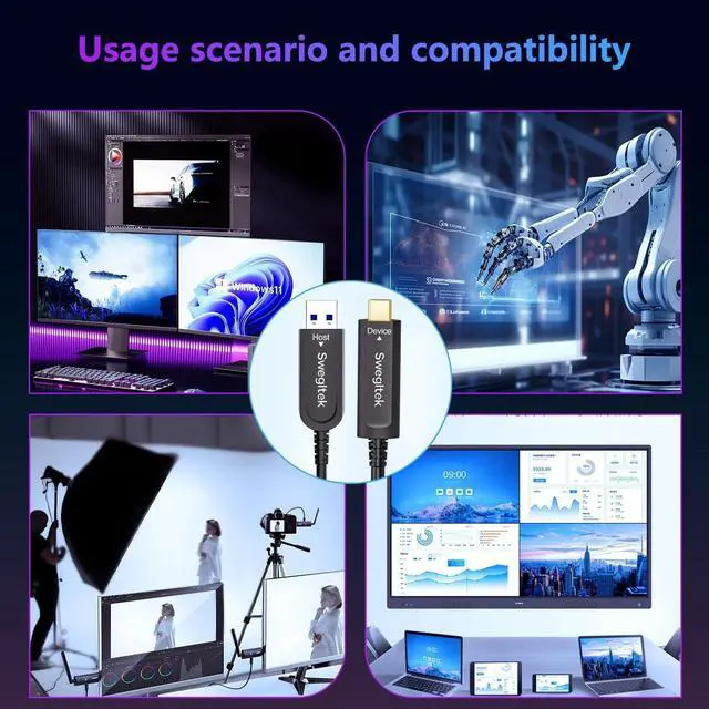 10Gbps Zero-Loss Fiber Optic SpeedAchieve flawless 10Gbps data transfer with our 33ft fiber optic USB-C cable, eliminating electromagnetic interference and data loss over 65ft distances. Ideal for 4K video conferencing, and industrial systems requiring secure high-speed transmission. ^^ Ultra-Slim 0.18 in Kevlar-Reinforced BuildEngineered with a bend-resistant Kevlar core and compact 0.18 in diameter, this USB-C optical cable survives longevity flex tests while slipping effortlessly through tight spaces in studio setups or AR/VR gear. ^^ Universal Plug-and-Play CompatibilityWorks seamlessly with MacBook Pro, Microsoft Azure, Barco ClickShare, cameras, and USB 3.2 / 3.1 / 3.0 / 2.0 devices.