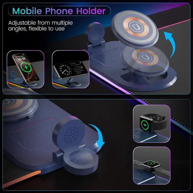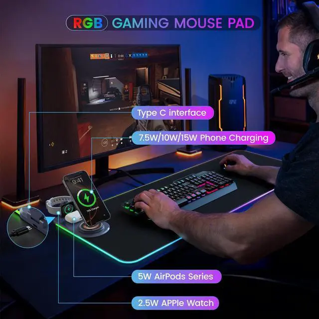 3-in-1 Magnetic Wireless Charging Mouse PadThe Large Mouse pad Built-in 15W wireless fast charging, which comes with a 20W PD charger and a 4.9 ft PD 3A fast charging cable. Desk Mat compatible with iPhone 15/14/13/12/11/X/XR/XS/8 series and Samsung Galaxy S23/S22/S21/S20/S10/S9/S8/Note 9/8 with 15W (Max) wireless charging power and other smartphones that support wireless charging; Airpods 3rd/ Airpods Pro 2nd/Airpods Pro with 5W wireless charging other Qi enabled devices; iWatch series (compatible with Ultra 2/Ultra/10/9/8/7/6 with 2.5W wireless charging power) series. ^^ 15 RGB LED Lights ModesRGB charging mouse pad made of super luminous material and can be customized with 15 lighting modes, including 11 static lighting modes and 4 dynamic effects.