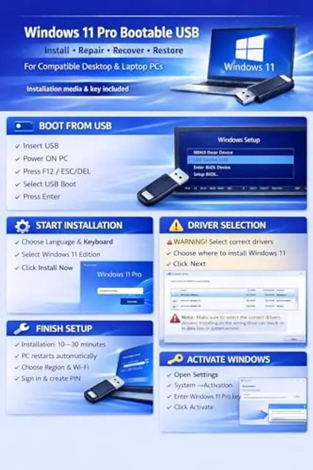 Windows 11 Pro 64Bit Edition Designed for professionals, businesses, and advanced users who need enhanced productivity and security features on compatible PCs. ^^ Product Key Provided After Purchase A Windows 11 Pro product key is provided via buyerseller messaging following order confirmation. ^^ Install, Repair & Recover Your PC Use this USB to perform clean installs, upgrade from older versions, repair corrupted systems, or recover nonbooting PCs. ^^ Easy StepbyStep Setup Guide Clear instructions included for installation, boot selection, and activation ideal for beginners and professionals. ^^ Perfect for Home, Office & IT Technicians A dependable tool for system builders, IT support, PC repair shops, and everyday users.