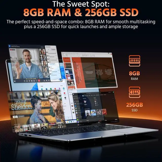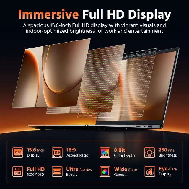 The Sweet Spot: 8GB RAM & 256GB SSDExperience the perfect balance of speed and space. With 8GB of RAM, you can smoothly run multiple office apps, dozens of browser tabs, and video calls simultaneously. Paired with a fast 256GB SSD, it offers quick boot-ups, instant app launches, and ample room for all your documents, presentations, and media files. This is the ideal setup for efficient, everyday productivity ^^ Fully Connected, Crystal ClearStay connected and entertained with fully-loaded connectivity. Dual-band Wi-Fi 5 ensures a fast, stable internet connection. Bluetooth 4.2 enables quicker pairing and a longer range with your devices. Dual speakers deliver immersive stereo sound for media. Plus, the HD webcam and dual microphones make your video conferences and online classes crystal clear and hassle-free ^^ Immersive Full HD DisplayImmerse yourself in a spacious 15.6 -inch Full HD display. The 16:9 screen ratio means your movies and videos fill the screen perfectly. With 250 nits of brightnessthe sweet spot for indoor useenjoy crisp, clear visuals for work or entertainment ^^ Ports for Everything. No Dongles NeededConnect everything, effortlessly.