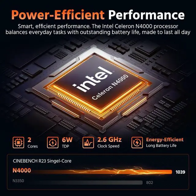 Power-Efficient PerformancePowered by the ultra-efficient Celeron Processor N4000, this laptop is designed for smart computing. With a minimal 6W TDP, it intelligently balances everyday taskslike web browsing, document editing, and video callswith exceptional battery life. Its not about raw power; its about doing what you need, all day long, without hunting for an outlet ^^
