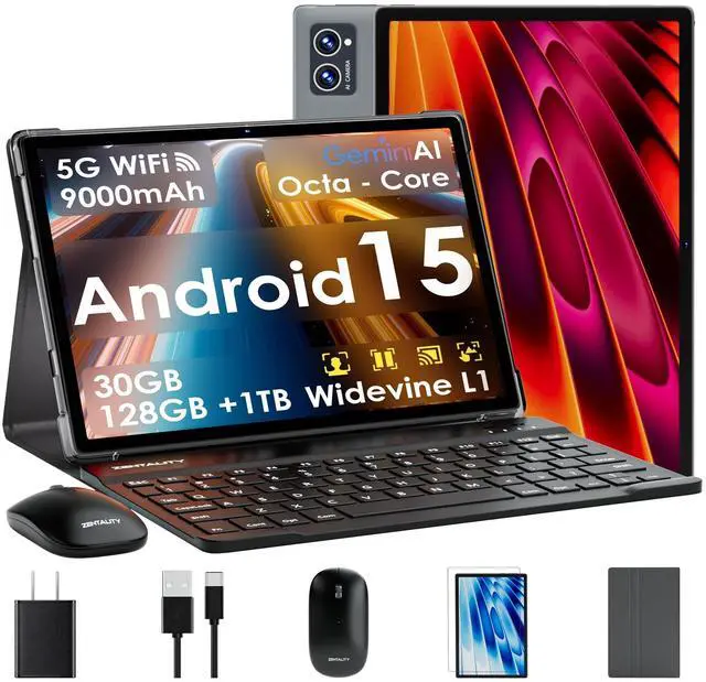 [High-Speed Performance & Gemini AI 2.0 Smart Assistant] ZENTALITY 2026 Android tablet features Android 15 OS with enhanced security, privacy protection, and an ad-free experience. With 30GB RAM and a 2.0GH z Octa-Core processor, enjoy lightning-fast app launches, ultra-responsive touch controls, and rock-solid system stability. Gemini AI 2.0 acts as your 24/7 smart assistant, offering voice control, real-time translation, and intelligent photo recognition for effortless work, study, gaming, and streaming. ^^ [Widevine L1 HD & Eye-Care Display] 10.1 inch HD IPS tablet with keyboard. Certified with Widevine L1, it supports HD streaming on Prime Video, Disney+, YouTube, Hulu, and more.