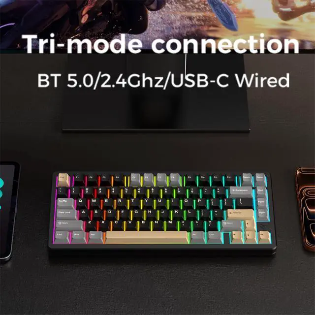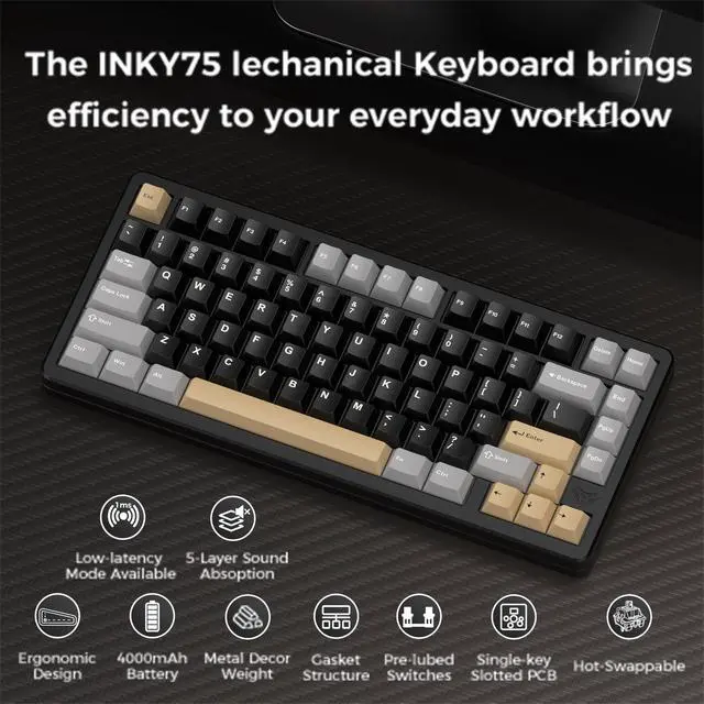 Full Aluminum Chasis wireless mechanical keyboardThe Inky 75 is a high-quality 75% teclado mecanico with a full aluminum chasis, enhanced by a glitter finish. This design not only adds a modern and elegant touch, but also ensures solid build quality that withstands daily wear and tear. Its a perfect fit for gamers, professionals, and mechanical keyboard enthusiasts looking for durability and style in one package. ^^ Satisfying Sound with Five Layers of Dampening Designed with sound in mind, 75 percent keyboard includes five layers of acoustic padding: PORON plate foam, IXPE switch pad, PET acoustic film, EPDM case foam, and PET insulation film. These layers work together to reduce hollowness and deliver a smooth, creamy sound signature with every keystroke. Whether you're streaming, gaming, or working, this keyboard offers a refined typing experience that feels focused and satisfying. ^^ VIA-Compatible & Lower lamp position RGB backlightingThe Inky 75 compatible with VIA web driver, giving users full control to program and remap keys, adjust lighting effects, and create macros. Paired with south-facing RGB LEDs, the keyboard ensures optimal backlight visibility. With multiple color options and customizable modes, it's perfect for users who enjoy personalized lighting setups. ^^ Triple Mode Connection & Long Battery LifeEquipped with three connection modesBluetooth, 2.4GH z wireless, and USB-C wiredthe Inky 75 offers seamless device switching and flexibility. Its built-in 4000mAh battery provides up to a week of wireless use on a single charge with backlight off, making it great for both office and gaming setups. Switching between devices has never been this convenient. ^^ Hot-Swappable PCB & Premium Stock SwitchesThe Inky 75 features a hot-swappable PCB that supports both 3-pin and 5-pin mechanical switches, allowing users to easily swap switches without soldering.
