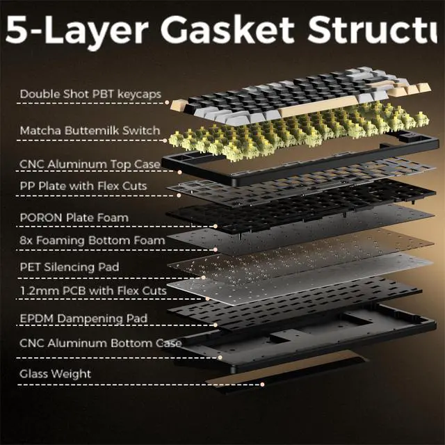 • Satisfying Sound with Five Layers of Dampening Designed with sound in mind,75 percent keyboard includes five layers of acoustic padding: PORON plate foam, IXPE switch pad, PET acoustic film, EPDM case foam, and PET insulation film. These layers work together to reduce hollowness and deliver a smooth, creamy sound signature with every keystroke. Whether you're streaming, gaming, or working, this keyboard offers a refined typing experience that feels focused and satisfying.