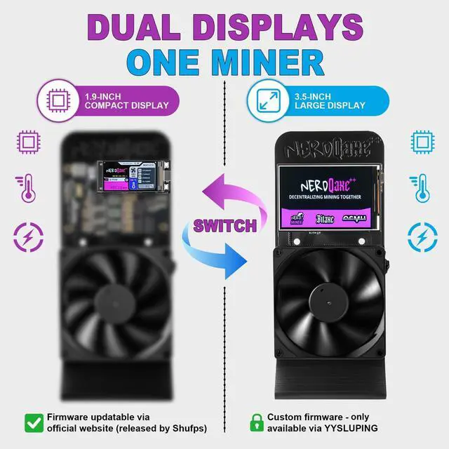 Glance: Our innovative dual-display system pairs a 1.9 -inch screen (full official firmware compatibility + stable updates) with a 3.5 -inch screen (custom YYSLUPING firmware). Both screens show real-time hashrate, temperature, voltage and network status at a glance. Equipped with hardware-independent 1.9 / 3.5 -inch LCDs and a single-port connection, the two screens are effortlessly interchangeable (one in use at a time) to fit your monitoring needs. The 3.5 -inch large screen elevates readability and operation ease for a premium monitoring experience. ^^