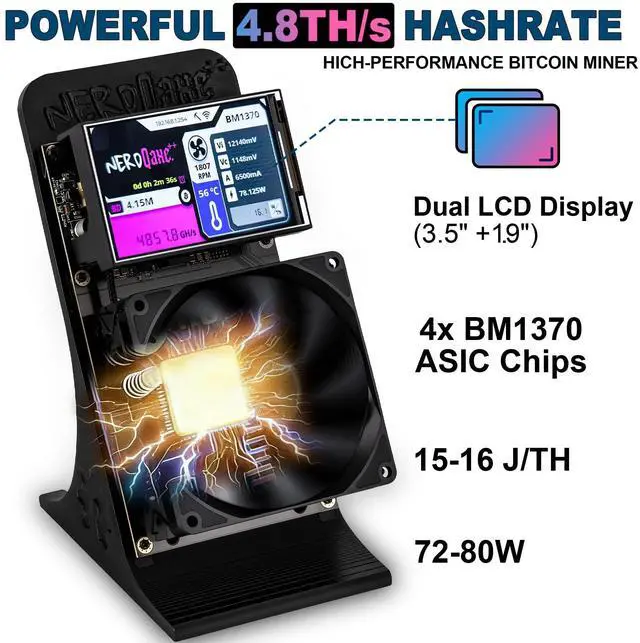 Power: Equipped with four industry-leading BM1370 ASIC chips ( 1.2 TH/s each), the NerdQaxe++ delivers a total hashrate of 4.8 TH/s, optimized exclusively for SHA256 Bitcoin mining. With an exceptional power efficiency of 1516 J/TH and an operating consumption of just 7280W, it achieves the perfect balance between high performance and low energy useideal for 24/7 home mining without excessive electricity costs. ^^ Smart Dual-LCD Monitoring At a