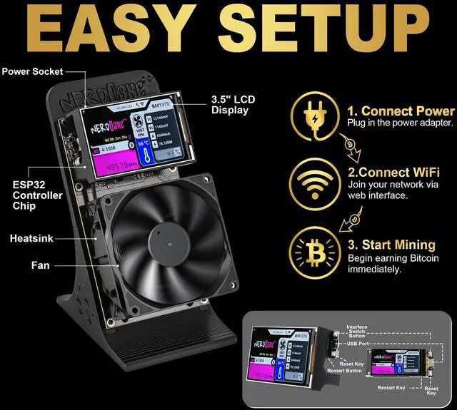 true plug-and-play simplicity: connect to your 2.4GH z WiFi through the intuitive AxeOS interface, enter your Bitcoin address, and begin mining in minutes. Built for tinkerers, developers, and enthusiasts, the device is fully open sourceenabling custom firmware, finetuned performance adjustments, and active contribution to the AxeOS project. It supports all major mining pools, solo mining via Stratum V1, and receives free ongoing updates. ^^ Advanced Cooling for Silent 24/7